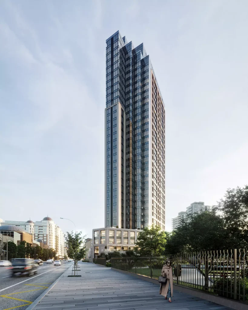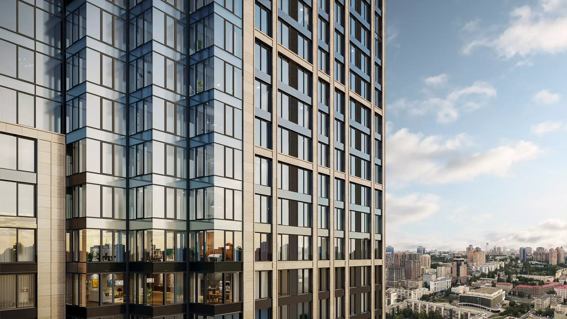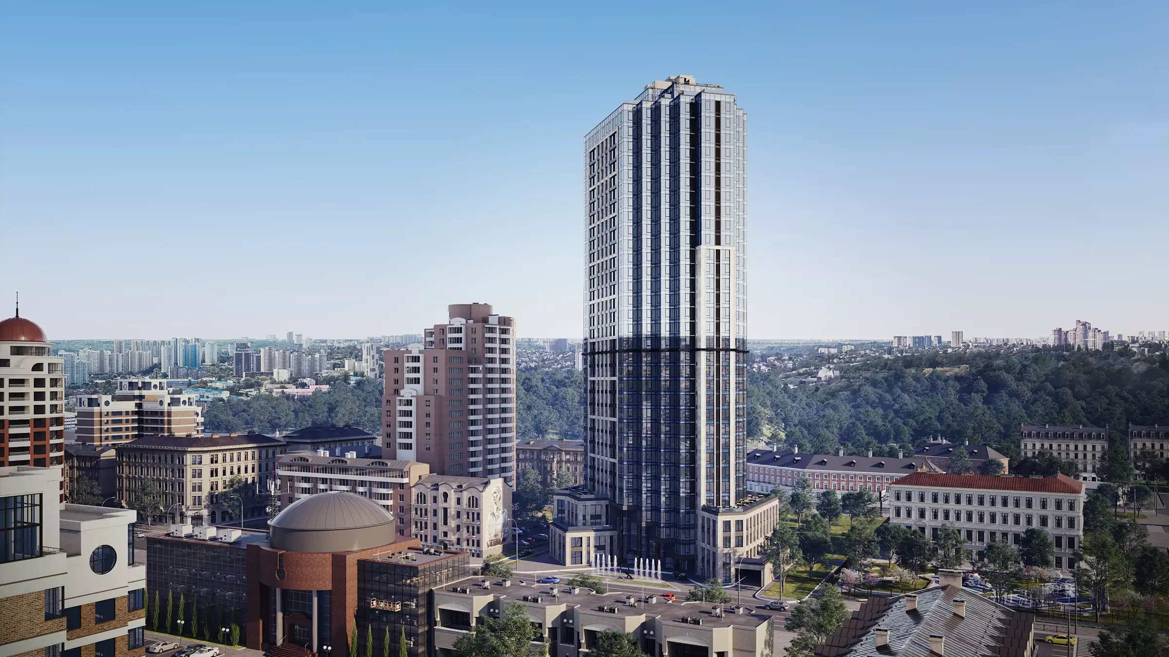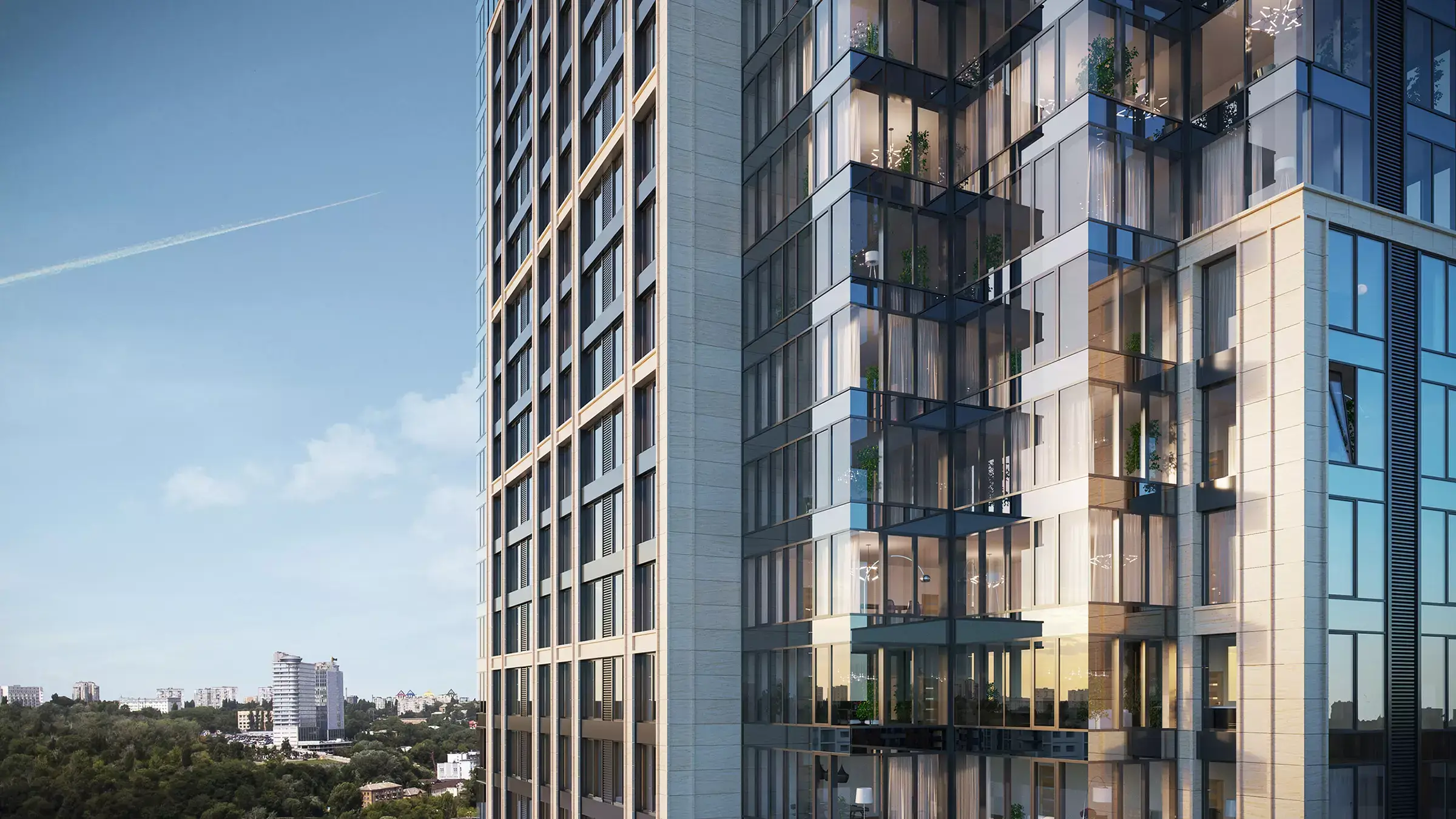 Against the backdrop of urban hustle and the mystical glow of Kyiv rises an impressive example of modern architecture – a business-class residential complex. The towering building reaching into the sky emphasizes prestige and a contemporary approach to comfortable living. The use of top-quality materials and an abundance of glass create an effect of transparency and elegance. This complex embodies the idea of prestige and luxurious living in the heart of the city, where every detail is meticulously designed for the highest comfort of its residents.